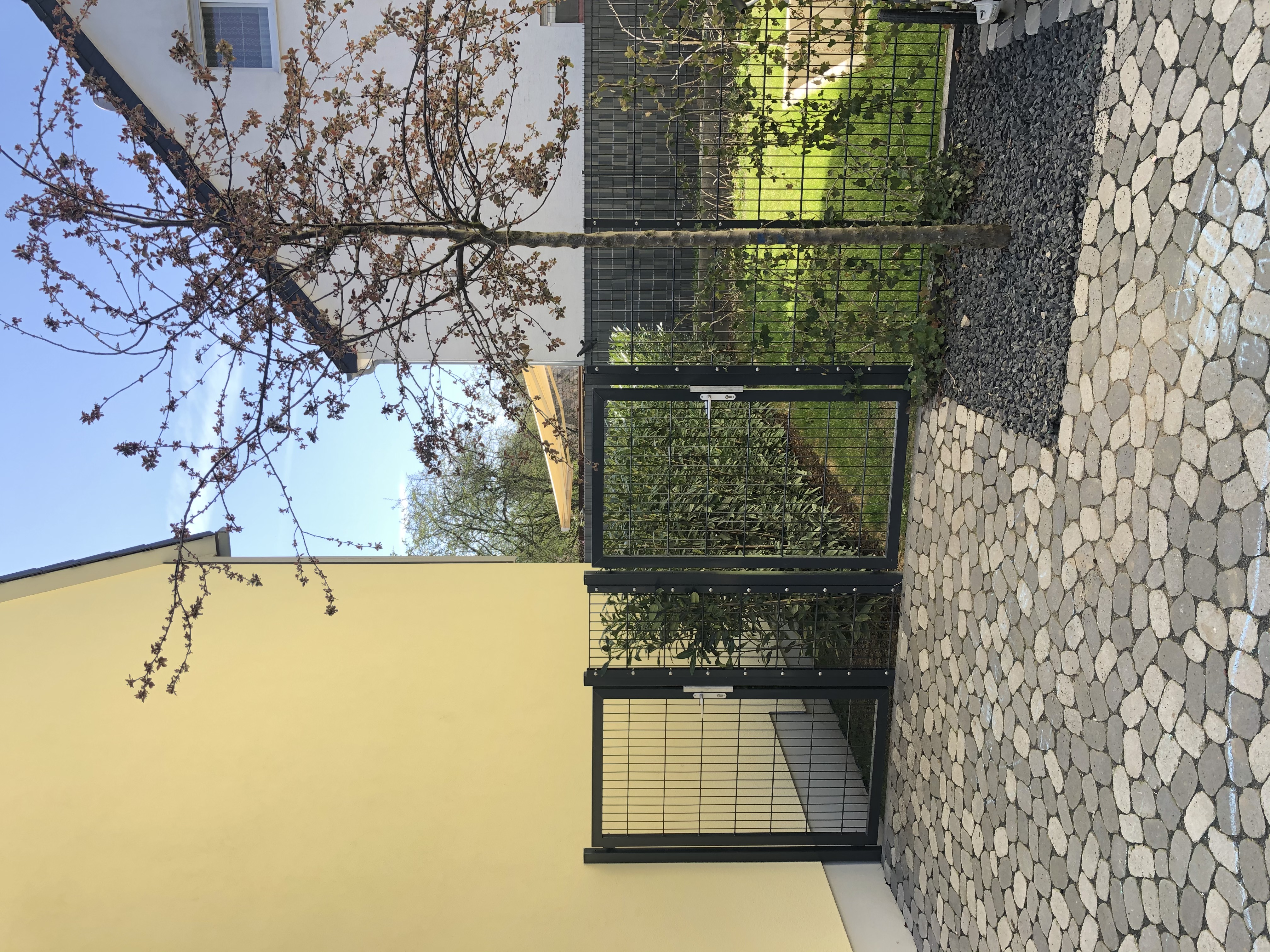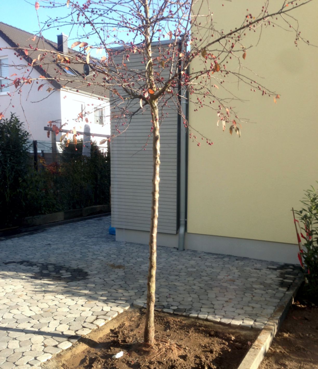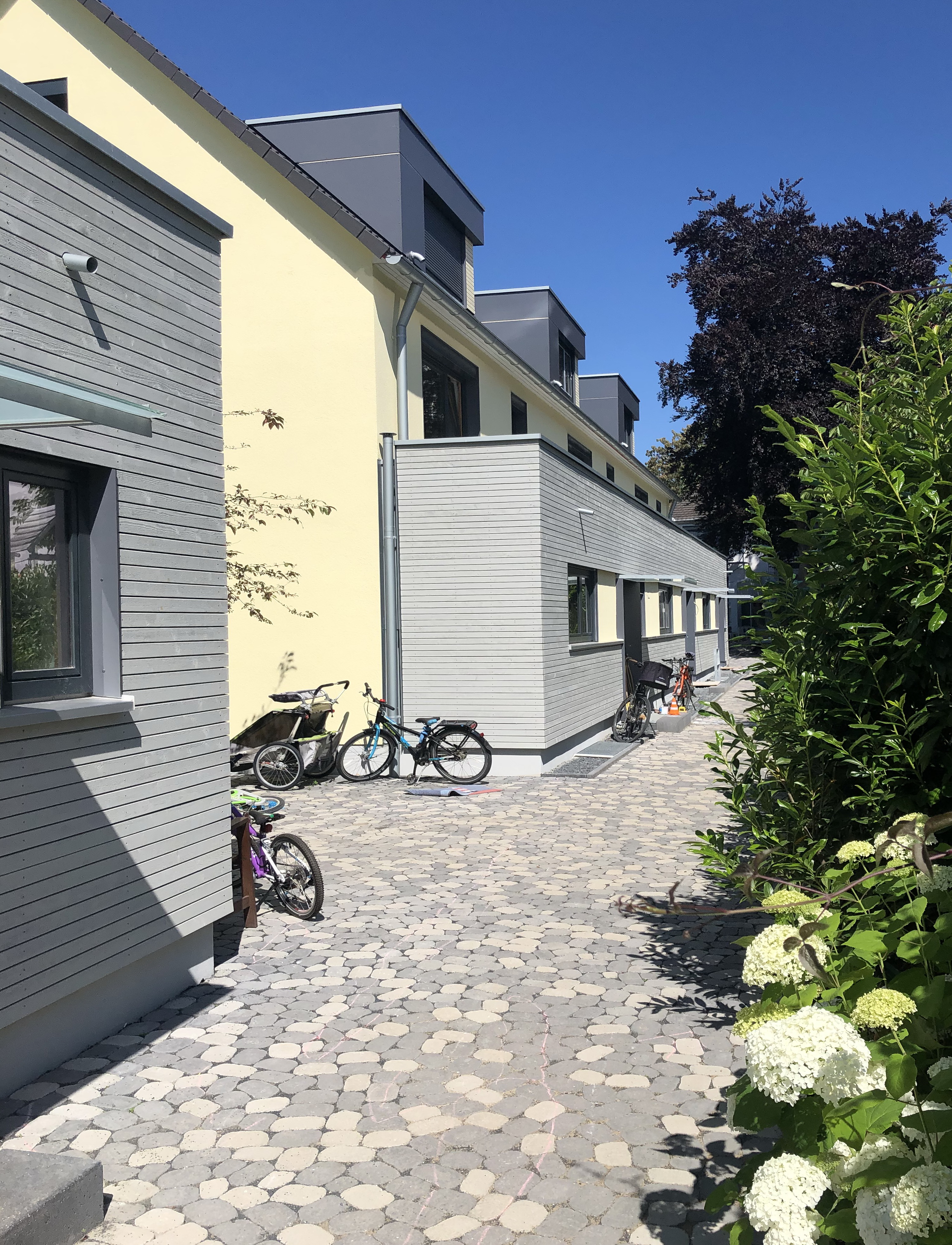 Der zentrale Hof mit der alten Buche ist neuer Mittelpunkt. An der gemeinsame "Spielstraße" mit "Sitzplätzchen" befinden sich die Zugänge in die Stadthäuser.