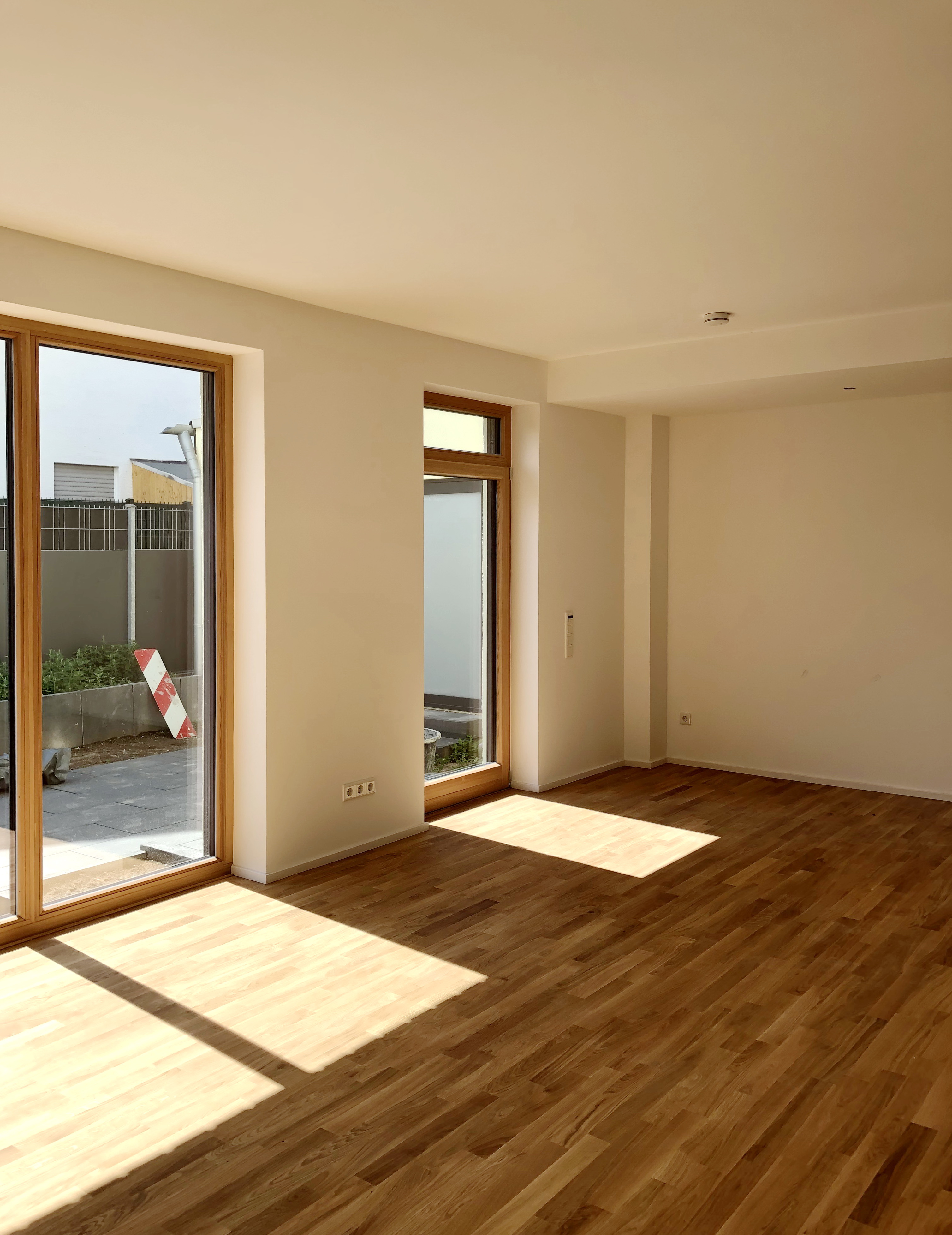Die großzügige Wohnküche öffnet sich zum Ess- und Wohnbereich. Hohe Terrassenfenster zum Gartenhof bringen viel Licht in das großzügig geschnittene Wohnzimmer.