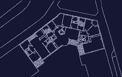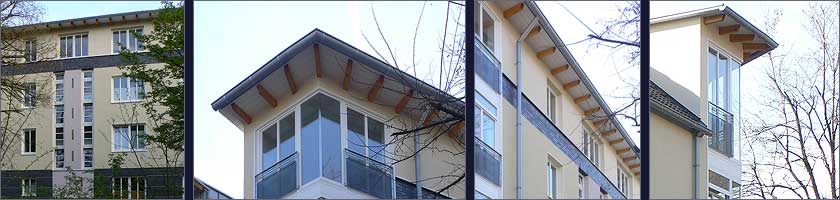 Die Fassade folgt dem Straßenverlauf und bildet ein angemessenes Gegenüber zu der im Jahr 1915 erbauten Dankeskirche (Architekt Friedrich Pützer aus Darmstadt). Die beiden Gebäudeecken werden durch die verglasten Erker betont und unterbrechen die ansonsten waagerecht gegliederte Fassade aus Putz und anthrazitfarbenen Klinker. Über 2 Treppenhäuser werden 12 Wohnungen erschlossen, in der Tiefgarage und der erdgeschossigen Garage befinden sich 15 Stellplätze. Dipl.-Ing. Francisco Molina, Architekt |