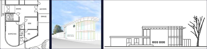 Der Entwurf reagiert auf die städtebaulichen Gegebenheiten durch die 2-geschossige Erweiterung. Zusätzlich erhält die Süd-West-Ecke eine verglaste Ausrundung. Diese 2-geschossige Glaswand mit den dahinter befindlichen Besprechungsräumen betont in besonderer Weise das Gebäude und setzt einen städtebaulichen Akzent. |